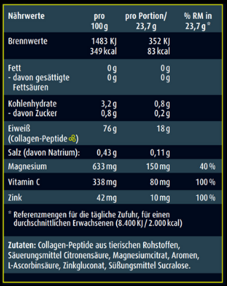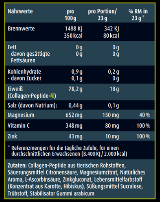Das enthaltene Vitamin C trägt zur Collagenneubildung für eine normale Funktion der Knorpel und Knochen bei. Zusätzlich trägt es zu einer normalen Funktion des Immunsystems bei.
